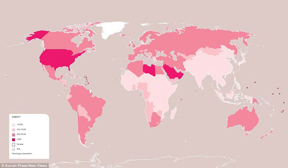 Diilustrasikan lewat persentase jumlah penduduk yang kegemukan, peta ini dibuat berdasarkan data WHO tahun 2014. Area paling gelap menunjukkan tingkat kegemukan penduduk yang tinggi. AS, Arab Saudi dan Libya termasuk yang banyak memiliki penduduk obesitas. Sementara Indonesia termasuk yang paling sedikit.